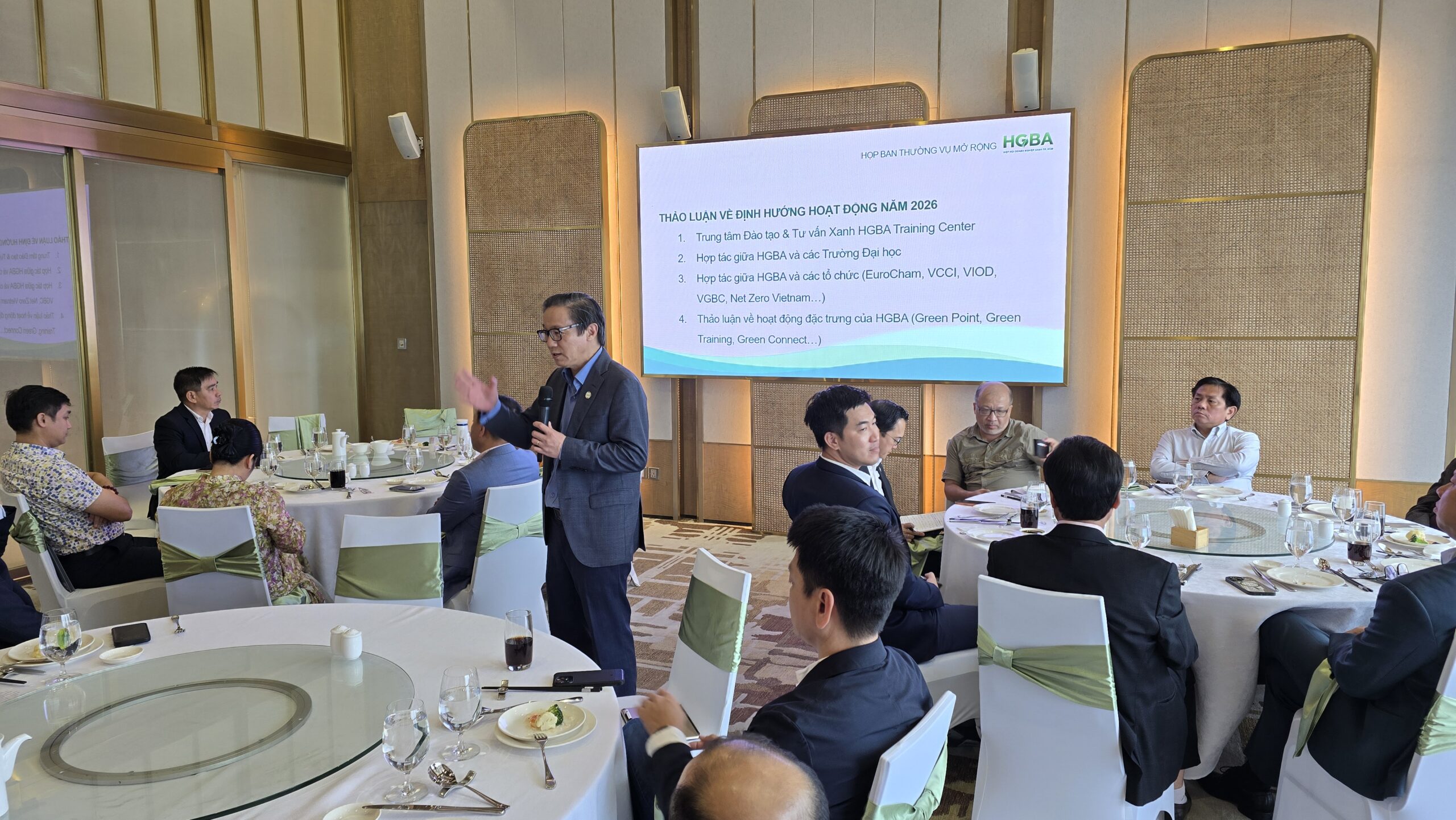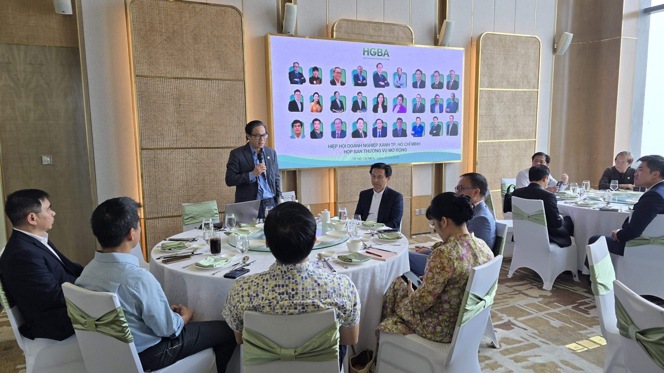 Ngày 03/12/2025, tại Phòng họp Sky Studio, tầng 69 – Vinpearl Landmark 81, Hiệp hội Doanh nghiệp Xanh TP.HCM (HGBA) đã tổ chức cuộc họp Ban Thường vụ mở rộng với sự tham dự của Ban Thường vụ, Ban Kiểm tra và các khách mời theo hình thức làm việc chuyên đề, kết hợp tiệc trưa trao đổi (Meeting & Luncheon) . Với sự chủ trì của Chủ tịch Đinh Hồng Kỳ, cuộc họp đã ghi nhận nhiều ý kiến đóng góp sâu sắc, thẳng thắn và mang tính định hướng chiến lược từ các Ủy viên. Phiên họp diễn ra trong tinh thần thống nhất cao về mục tiêu nâng tầm chất lượng hoạt động của Hiệp hội, thúc đẩy đổi mới mô hình vận hành và tạo giá trị thực chất cho cộng đồng doanh nghiệp xanh.