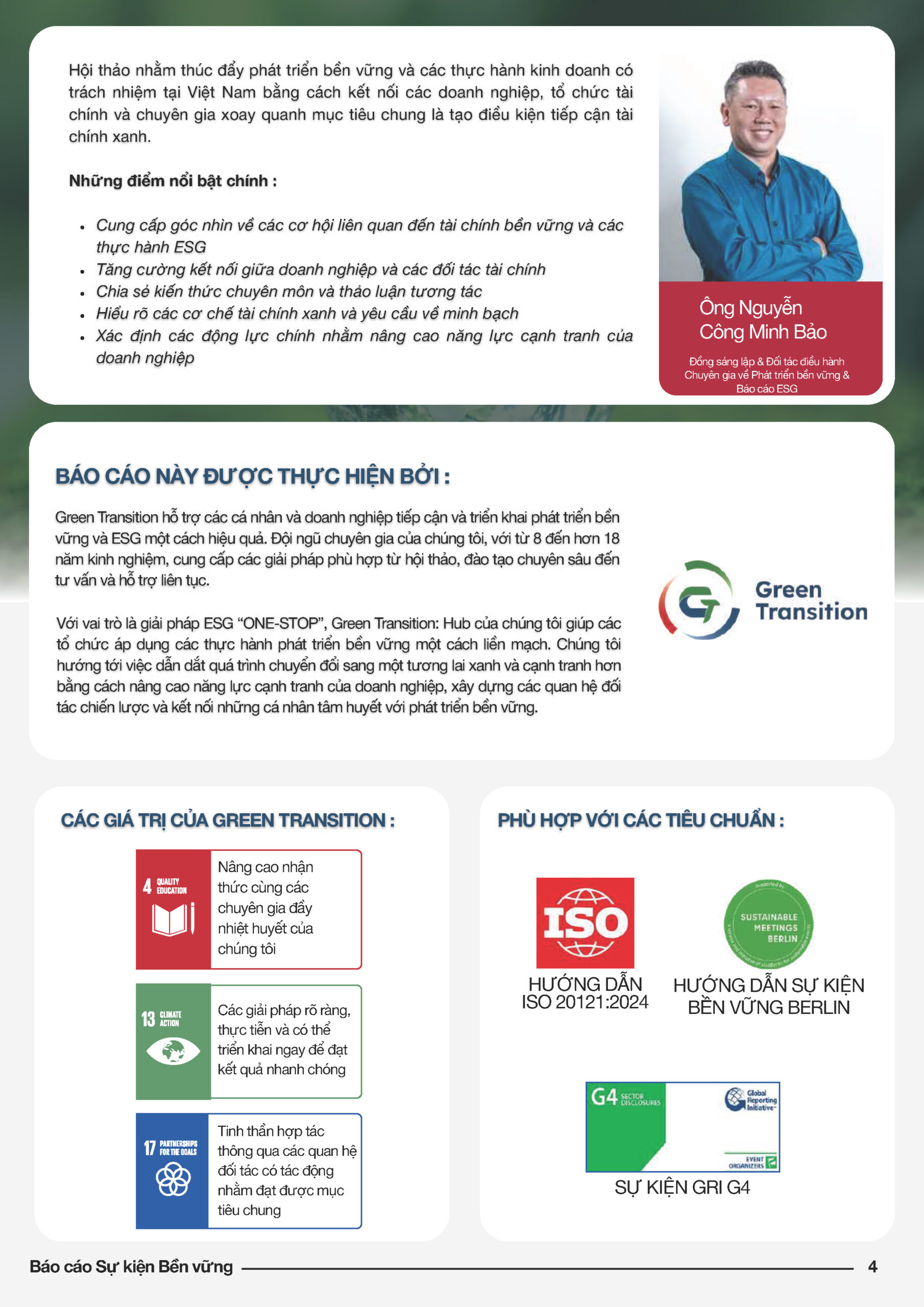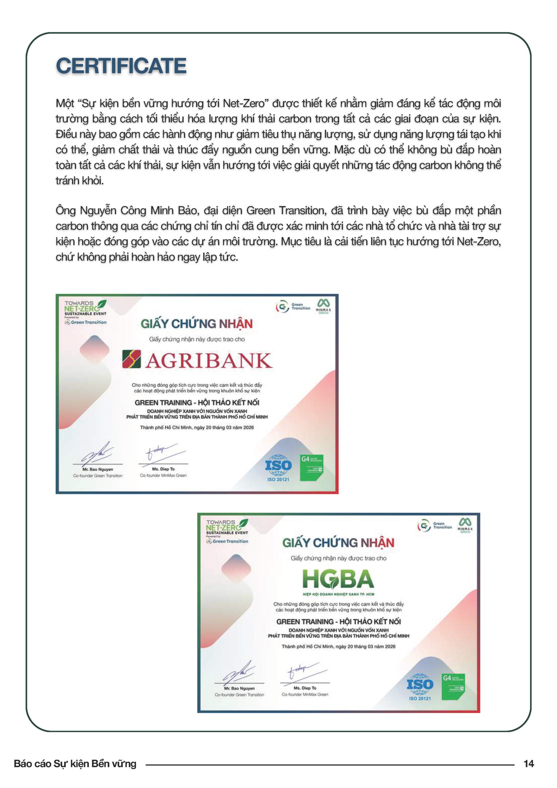 Trong bối cảnh xu hướng phát triển bền vững và kinh tế xanh đang gia tăng mạnh mẽ cả trong nước và trên toàn cầu, Hội thảo với sự tư vấn từ Green Transition, được ghi nhận là một sự kiện bền vững tiêu biểu. Sự kiện đạt 73/153 điểm theo bộ tiêu chí đánh giá, qua đó xếp hạng “Green Champion – Nhà vô địch xanh”.