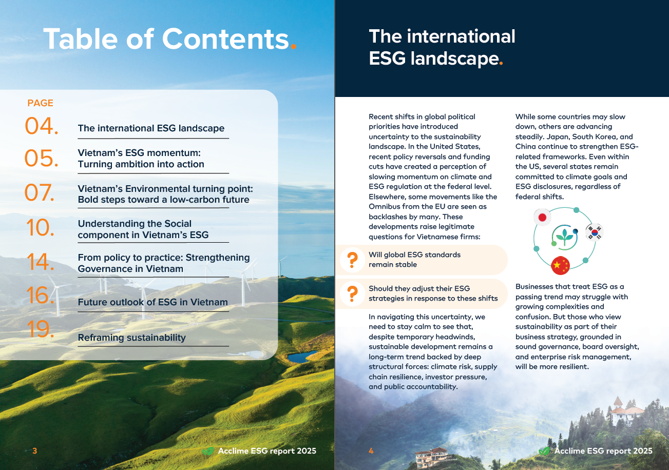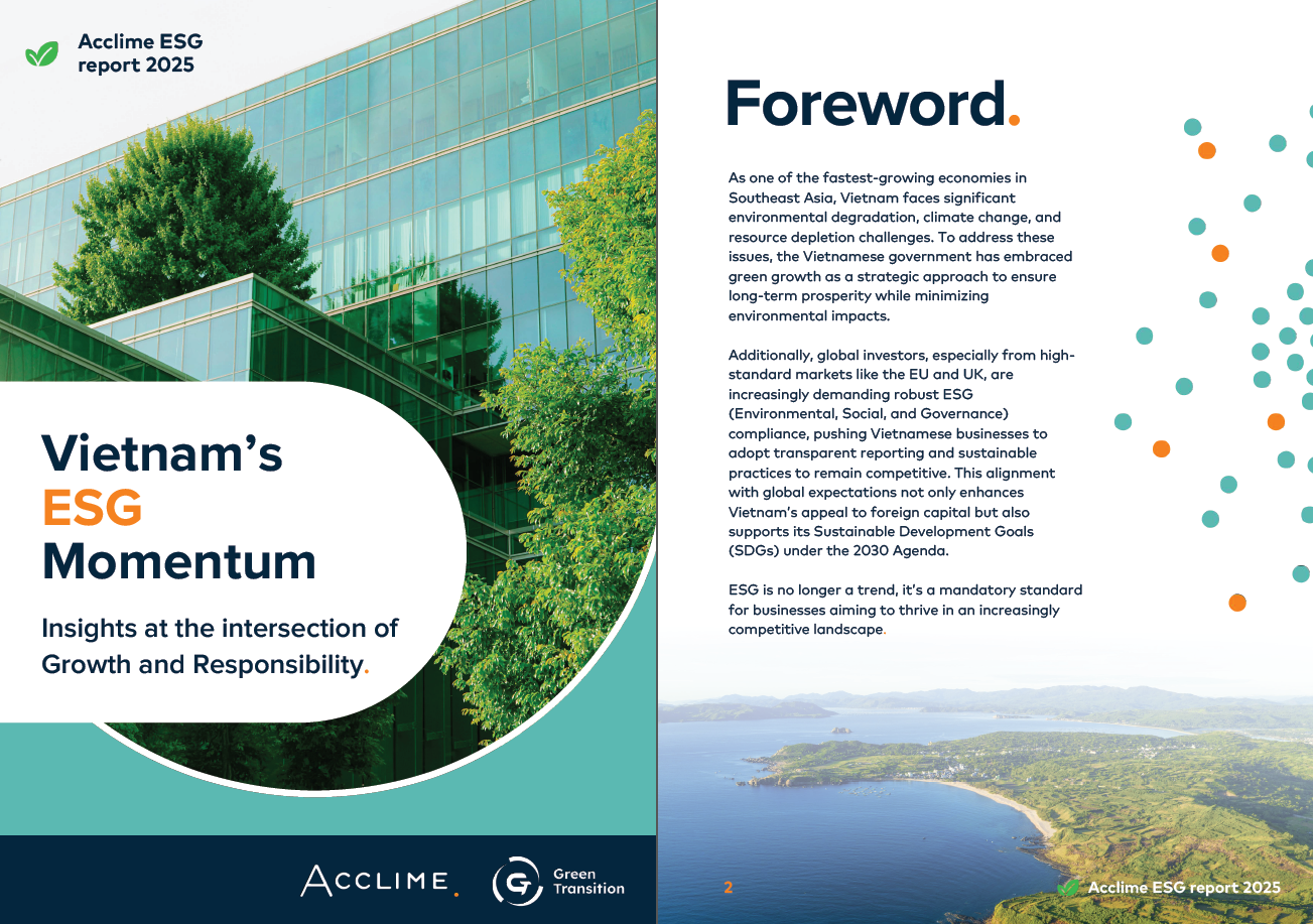 Mới đây, Green Transition Consulting & Training đã hợp tác cùng Acclime Vietnam phát hành báo cáo: “Động lực ESG của Việt Nam năm 2025: Khi Tăng trưởng cần đi đôi với Trách nhiệm”.