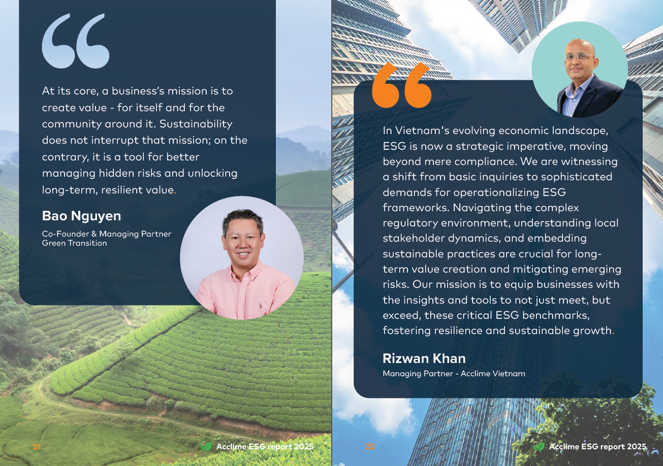 “Cốt lõi, sứ mệnh của doanh nghiệp là tạo ra giá trị – không chỉ cho chính mình mà còn cho cộng đồng xung quanh. Tính bền vững không cản trở sứ mệnh đó; ngược lại, đó là công cụ để quản lý rủi ro hiệu quả hơn và tạo dựng nên các giá trị lâu dài.” Ông Bảo Nguyễn, Đồng Sáng lập & Giám đốc Điều hành Green Transition Consulting & Training, chia sẻ trong báo cáo “Động lực ESG của Việt Nam 2025”