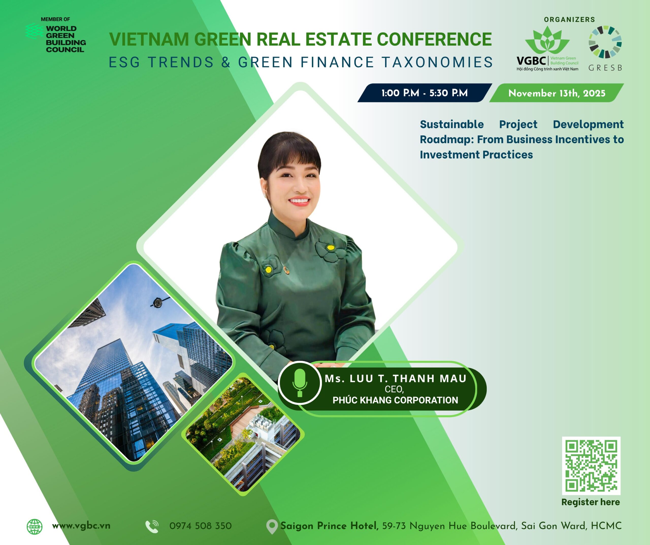 – Ms. Lưu Thị Thanh Mẫu, CEO, Phúc Khang Corporation, Phó Chủ tịch thường trực Hiệp hội Doanh nghiệp Xanh TP.HCM (HGBA)