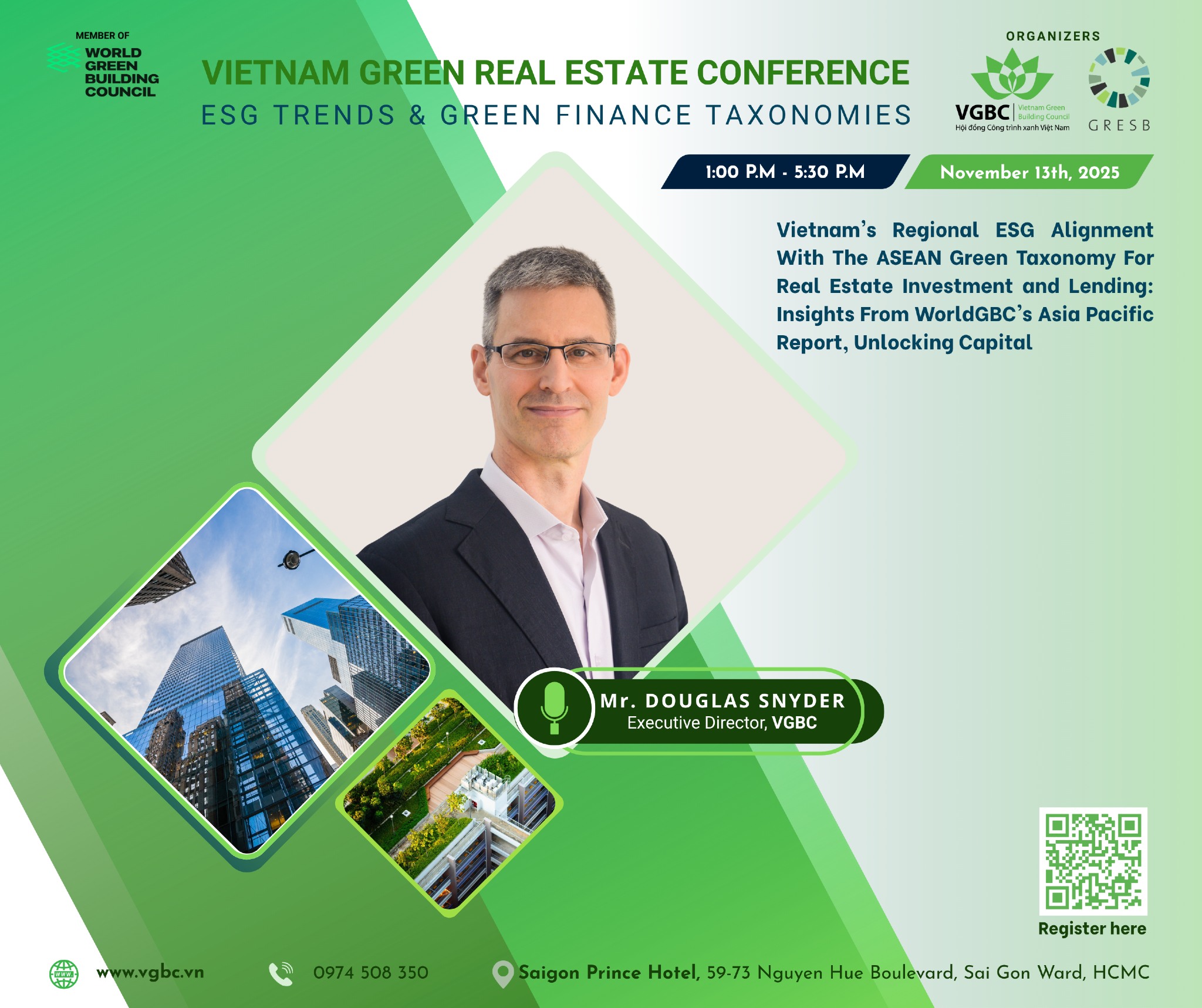 – Giải mã Danh mục Phân loại Xanh (Taxonomy): Mr. Douglas Snyder, Executive Director, VGBC sẽ phân tích “kim chỉ nam” mới của Việt Nam và quốc tế, giúp nhà đầu tư “nhận diện” dự án thật sự Xanh để cấp vốn.