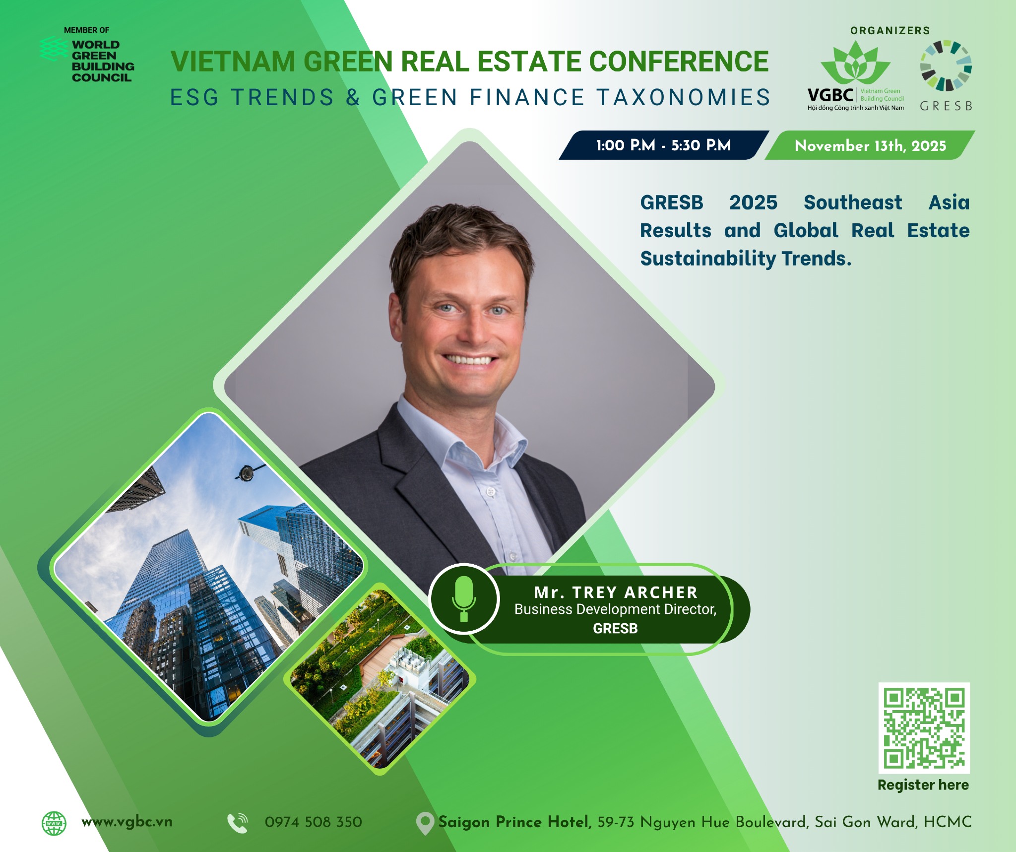 – Xu hướng ESG Toàn cầu & Lộ trình báo cáo ESG: Mr. Trey Archer, Business Development Director, GRESB sẽ phân tích dữ liệu ESG toàn cầu và Đông Nam Á và vạch ra lộ trình thực tế để doanh nghiệp Việt Nam bắt đầu báo cáo.