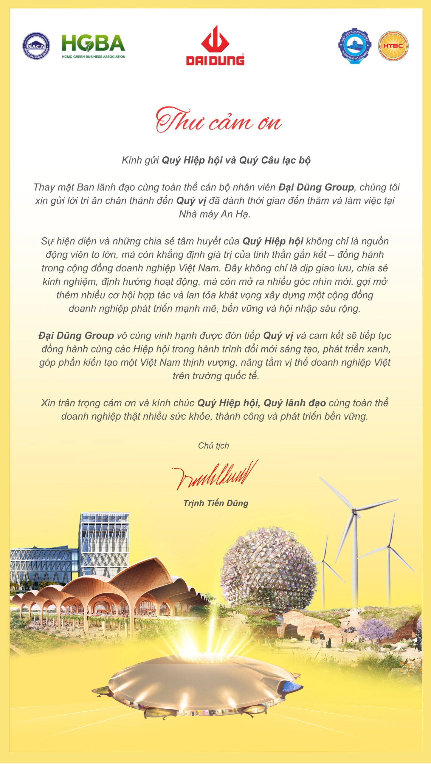 THƯ CẢM ƠN CỦA ĐẠI DŨNG GROUP ĐẾN HỘI DOANH NGHIỆP XANH TP.HCM (HGBA) NHÂN CHUYẾN THAM QUAN VÀ LÀM VIỆC TẠI NHÀ MÁY AN HẠ