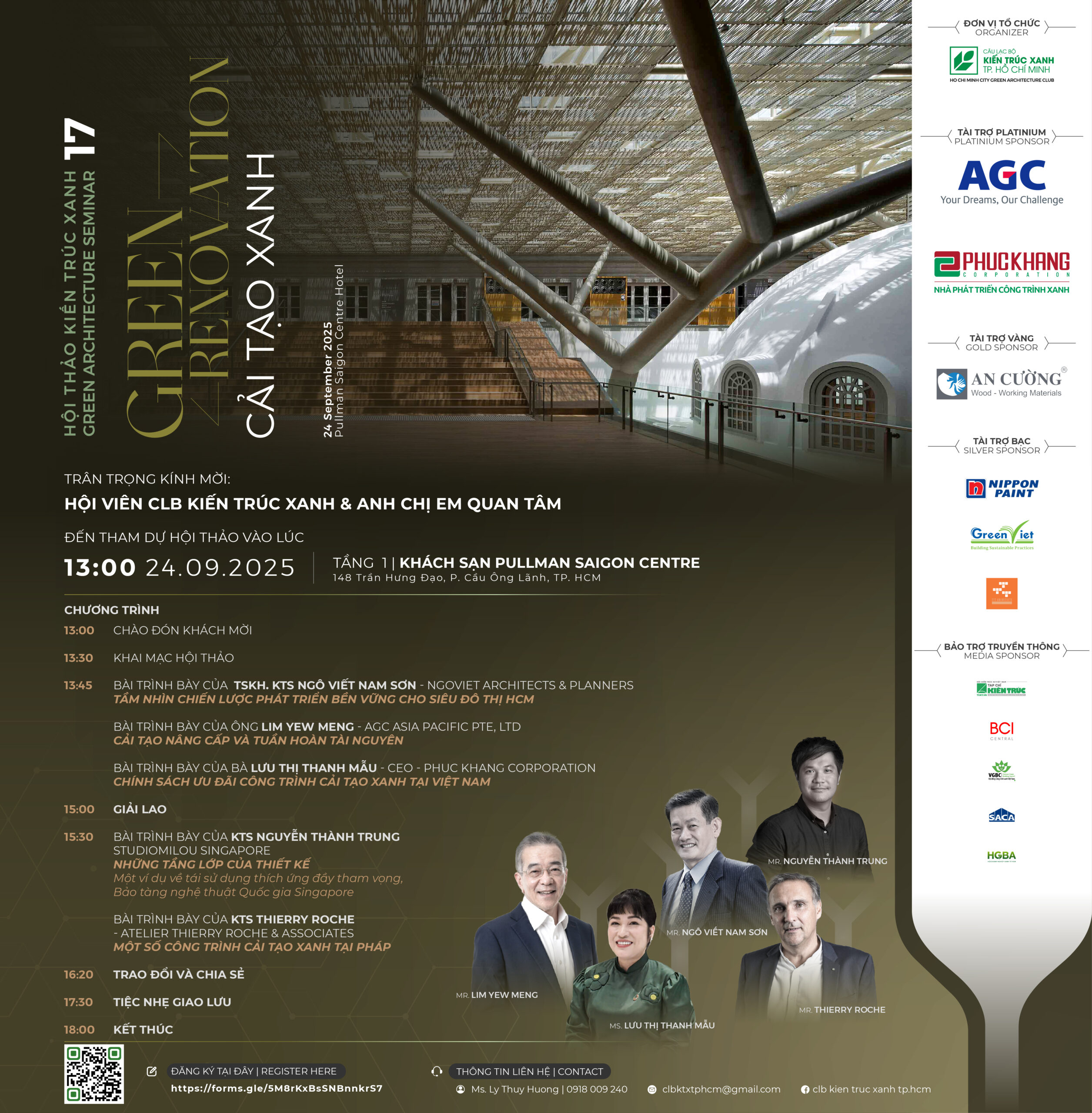HỘI THẢO KIẾN TRÚC XANH LẦN 17 “GREEN INNOVATION – CẢI TẠO XANH” SẼ ĐƯỢC TỔ CHỨC VÀO THỨ 4, NGÀY 24/09/2025