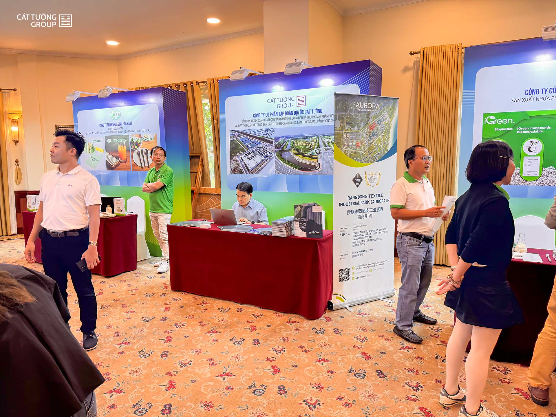 Tại sự kiện, Cát Tường Group đã có cơ hội trưng bày gian hàng, giới thiệu về Khu công nghiệp (KCN) Dệt may Rạng Đông (Aurora IP), một mô hình KCN sinh thái, tiên phong trong việc phát triển bền vững. Aurora IP thu hút sự chú ý đặc biệt khi có sự hiện diện của TOPT Textile, doanh nghiệp dệt may hàng đầu Nhật Bản, đã đầu tư xây dựng và đưa nhà máy vào sản xuất. Việc TOPT Textile lựa chọn Aurora IP không chỉ là minh chứng cho sức hấp dẫn của KCN đối với các nhà đầu tư quốc tế, mà còn khẳng định cam kết của Cát Tường Group trong việc tạo ra một môi trường sản xuất hiện đại, thân thiện với môi trường, đáp ứng các tiêu chuẩn cao nhất của các tập đoàn toàn cầu.