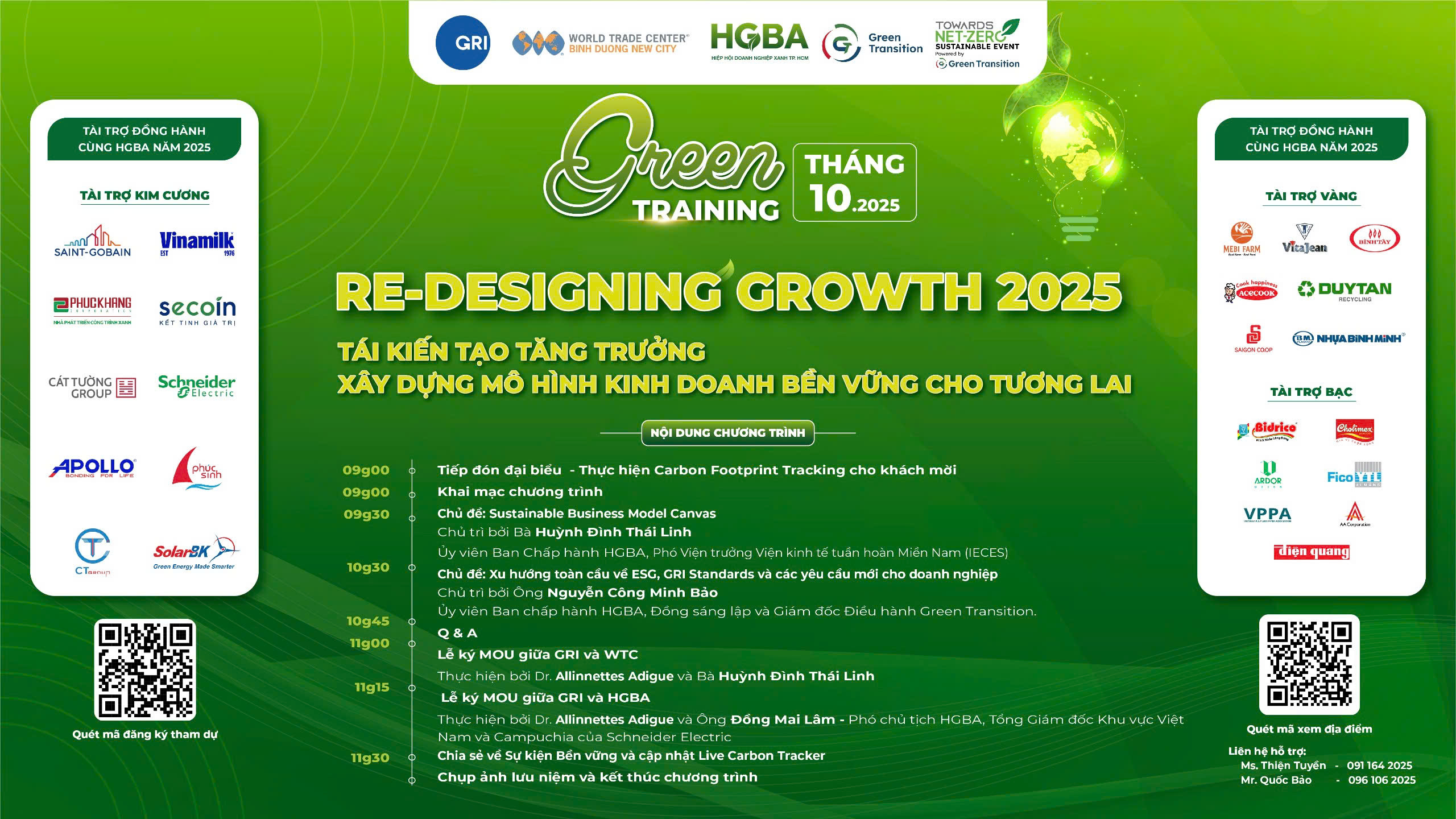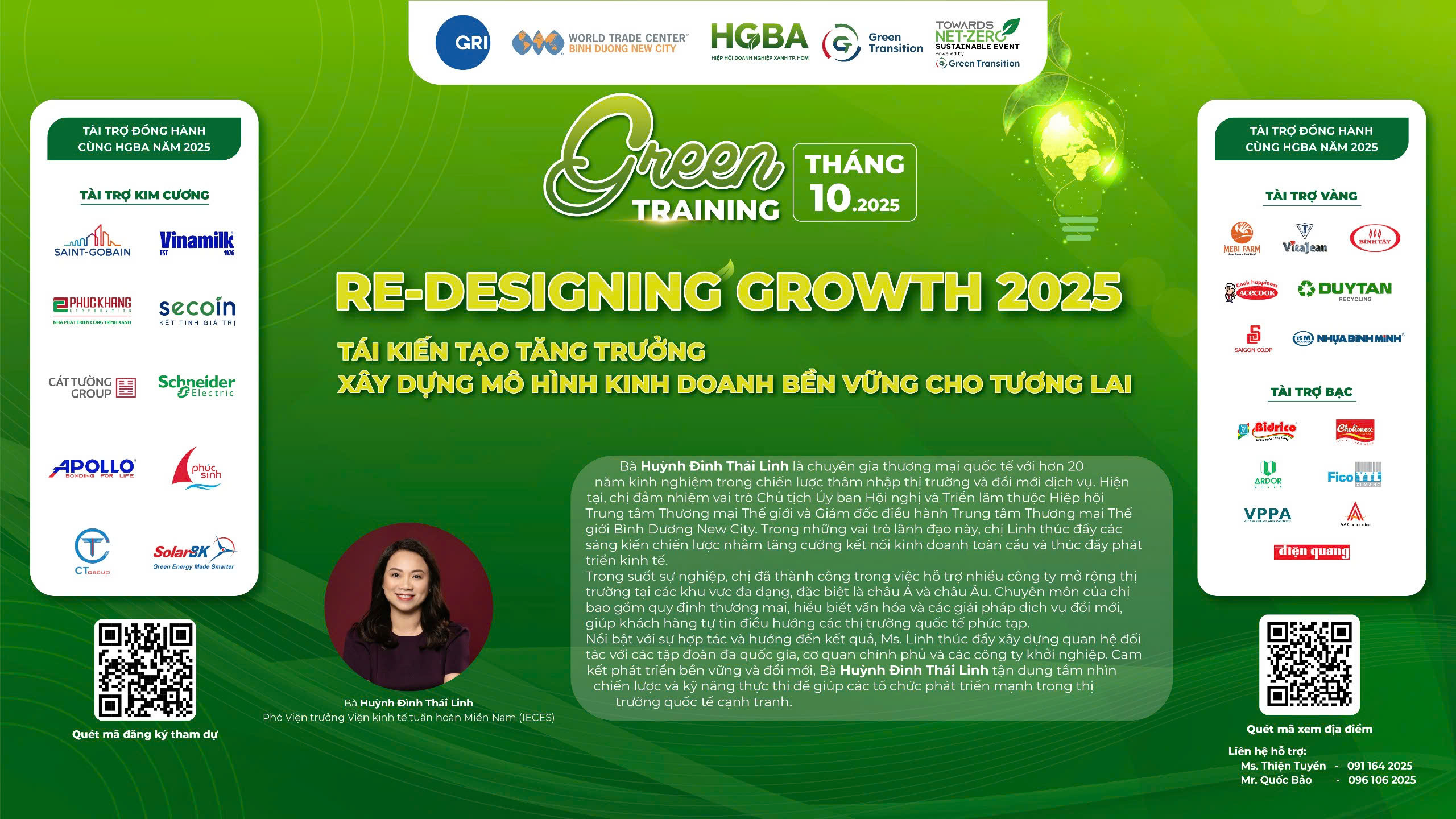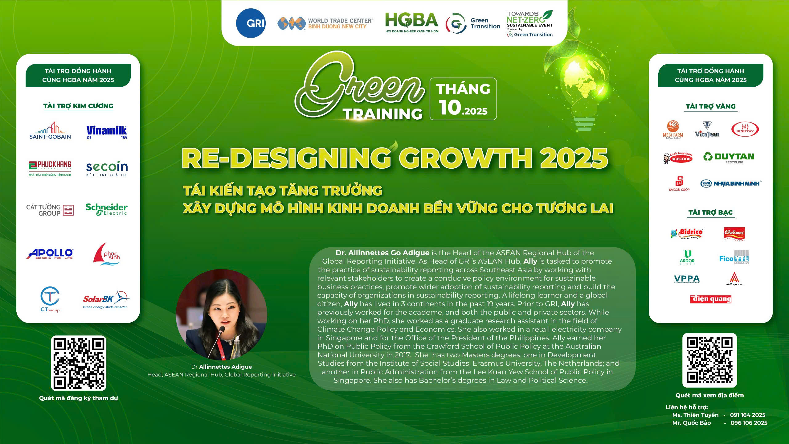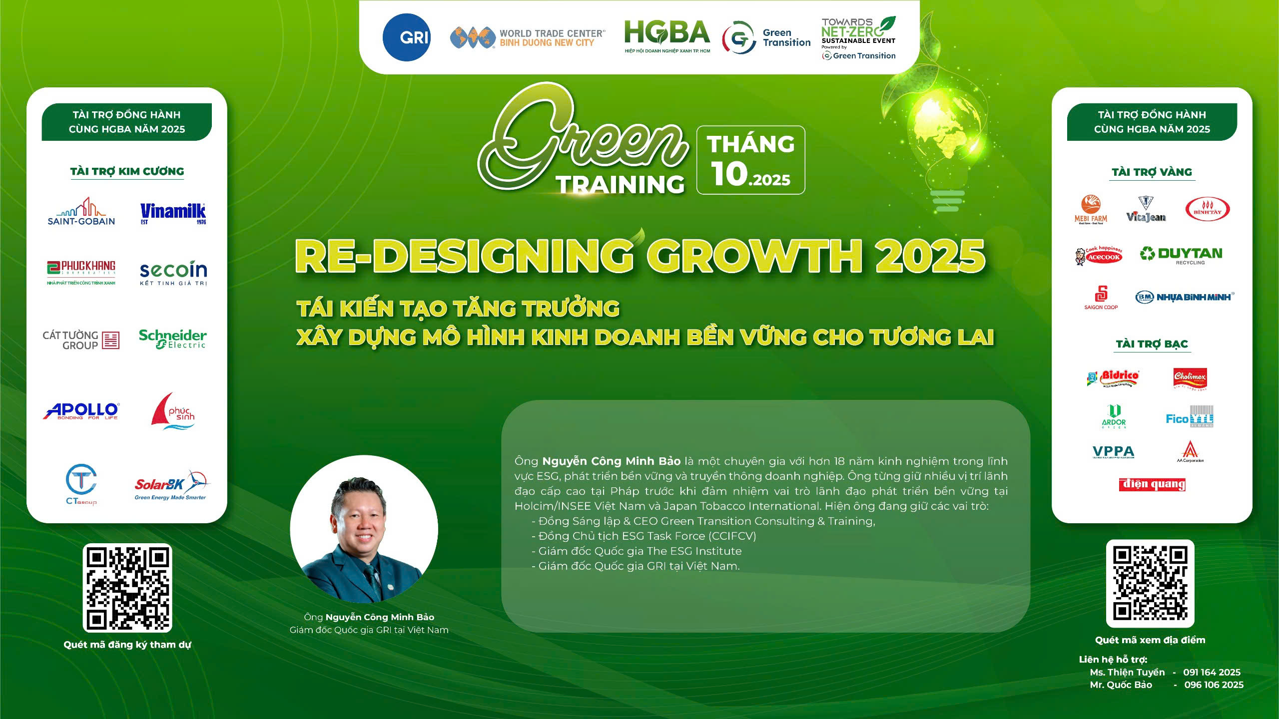 Re-Designing Growth 2025 được phối hợp tổ chức bởi World Trade Center Bình Dương New City (World Trade Center Binh Duong New City), Hiệp hội Doanh nghiệp Xanh TP. Hồ Chí Minh (HGBA), Global Reporting Initiative (GRI) và Green Transition Training and Consulting Company Limited (Green Transition), với mục tiêu đồng hành cùng cộng đồng doanh nghiệp trong hành trình chuyển đổi xanh và phát triển bền vững.