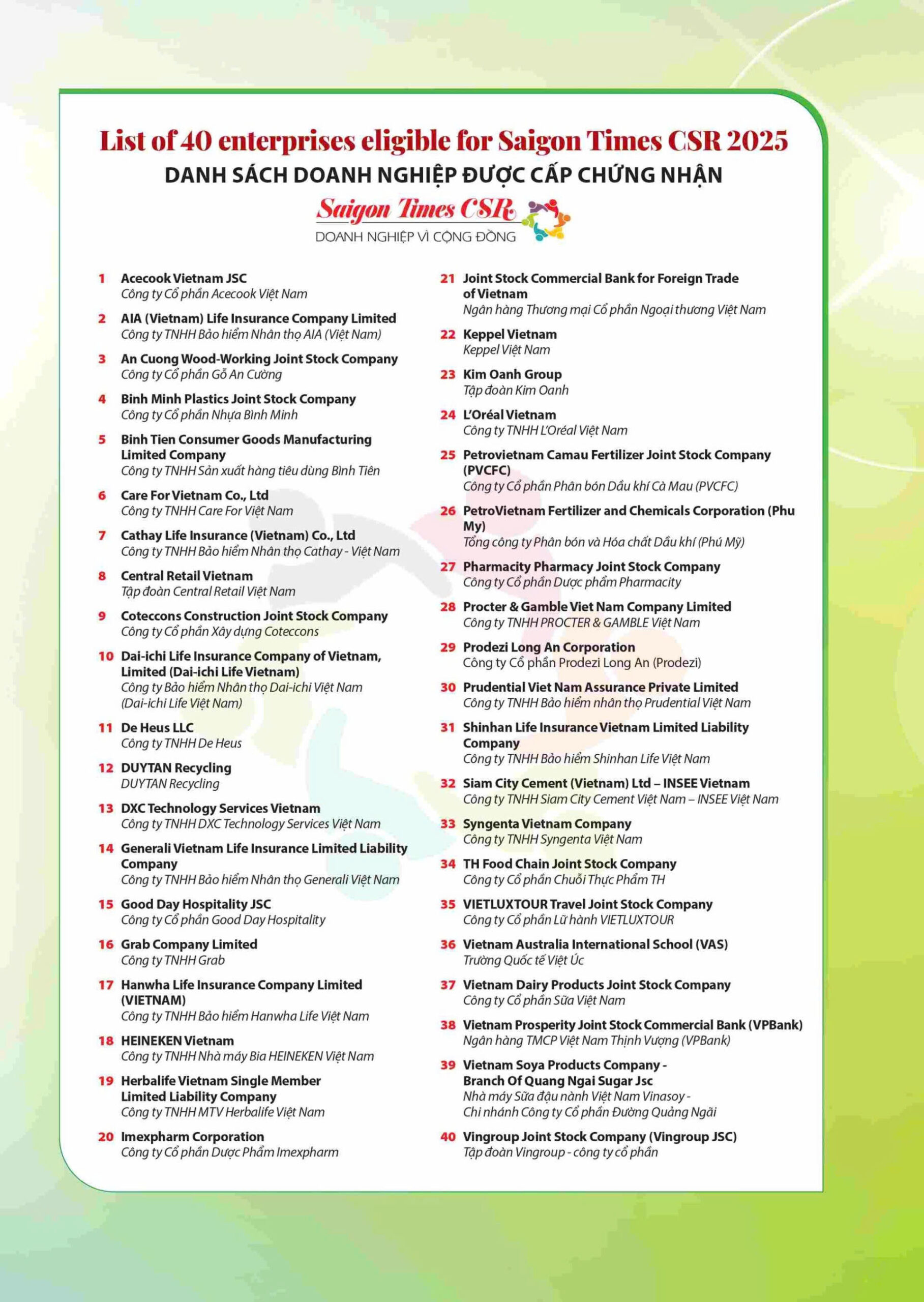 Đây là sự ghi nhận xứng đáng cho những nỗ lực bền bỉ của các doanh nghiệp tiên phong trong việc kết hợp hài hòa giữa phát triển kinh doanhtrách nhiệm xã hội, góp phần xây dựng một nền kinh tế xanh và phát triển bền vững cho Việt Nam.