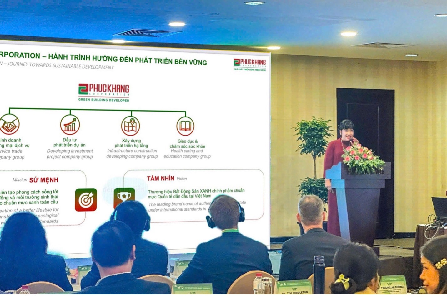 Theo bà Mẫu, Phuc Khang Corp. đã sớm xác định con đường phát triển bền vững trong đó trọng tâm là các dự án xanh. Doanh nghiệp lựa chọn 9 mục tiêu ưu tiên và 8 mục tiêu hỗ trợ trong 17 SDGs của Liên Hiệp Quốc – làm khung chiến lược phát triển dài hạn. Bà cũng giới thiệu dự án tiêu biểu: Khu Đô Thị Văn Hóa – Thương Mại – Du Lịch Làng Sen Việt Nam – công trình xanh đạt nhiều kỷ lục quốc gia, giải thưởng và chứng nhận quan trọng, điển hình nhất là Trung tâm hội nghị Tre Việt đạt chứng nhận LOTUS Gold.