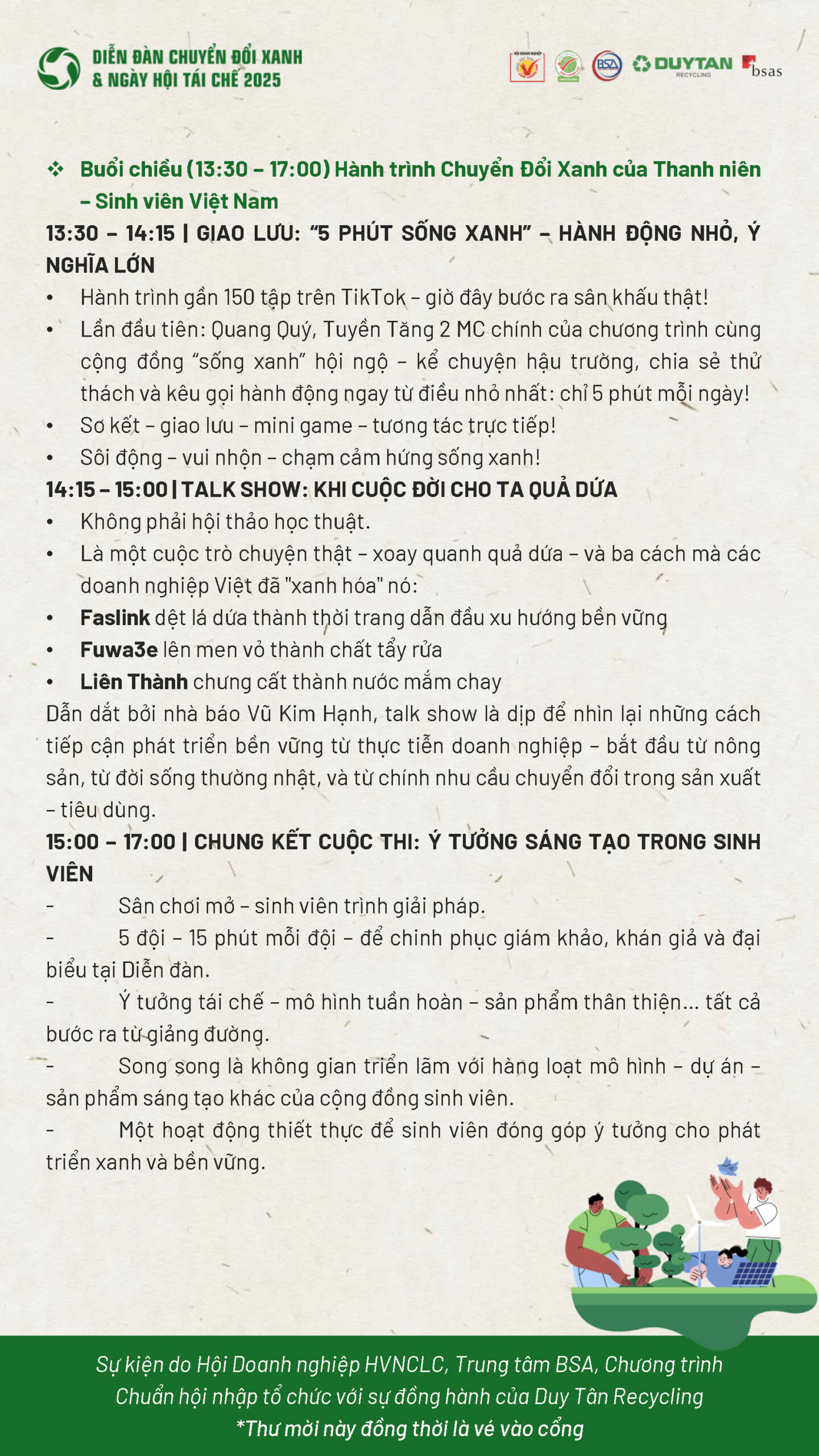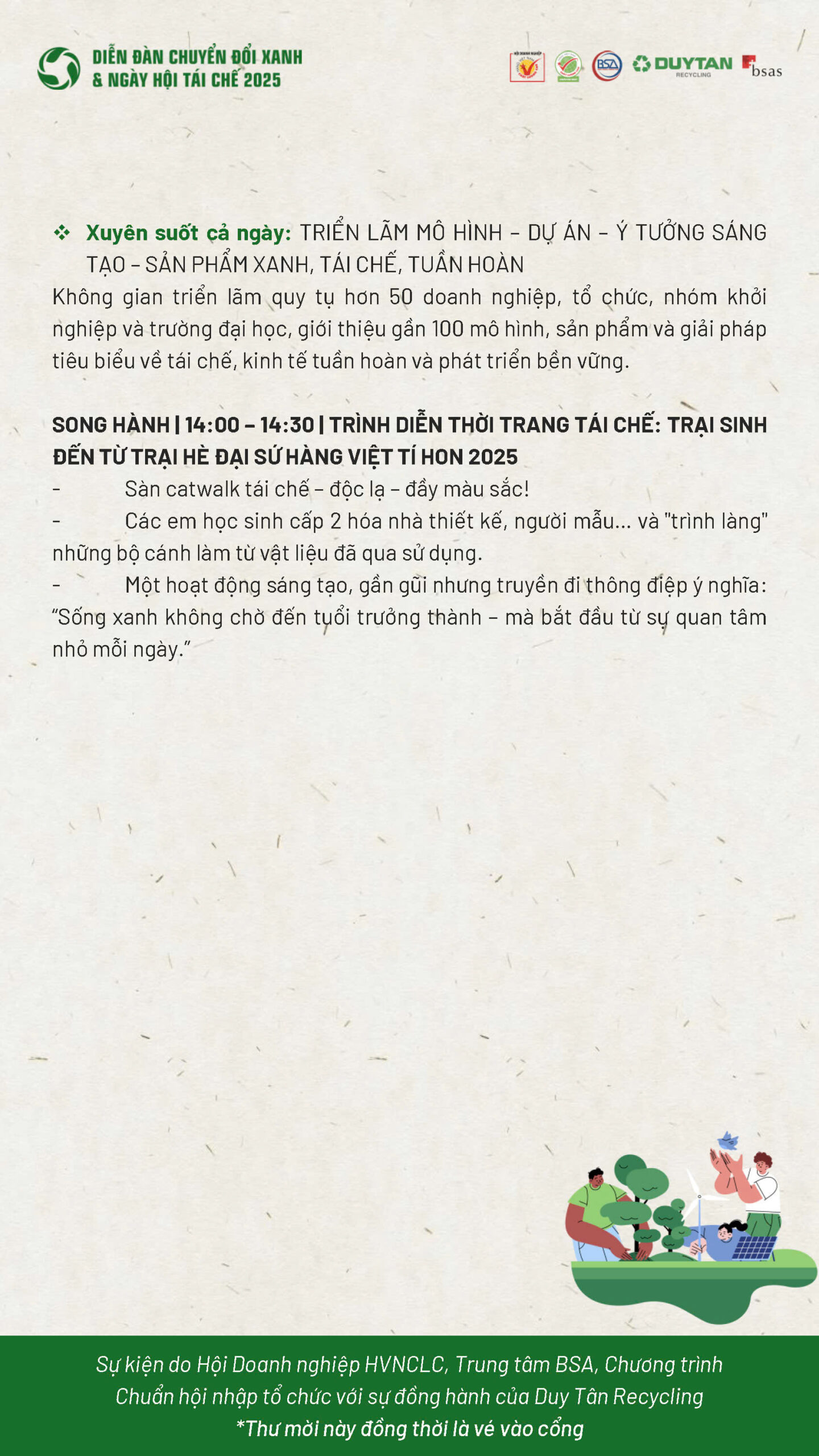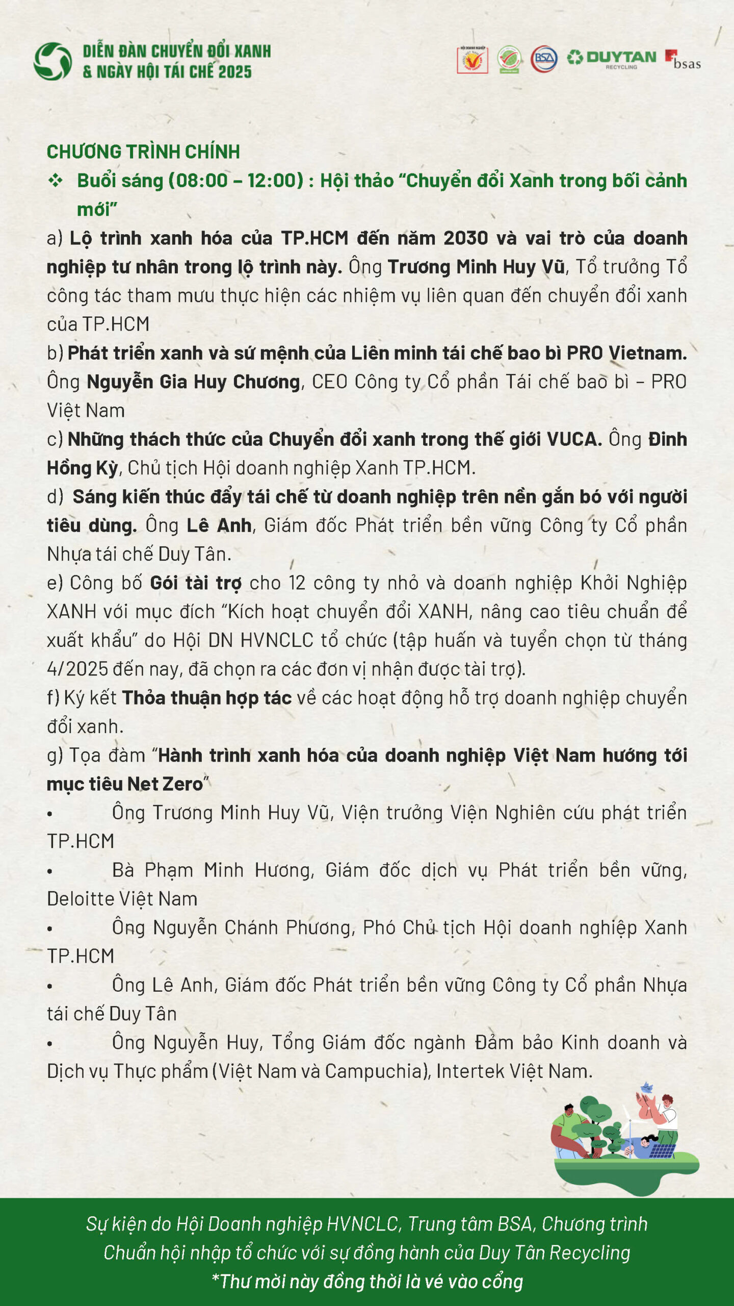 Sự kiện do Hội Doanh nghiệp Hàng Việt Nam Chất Lượng Cao, Trung tâm BSA, Chương trình Chuẩn hội nhập tổ chức với sự đồng hành của Duy Tân Recycling.