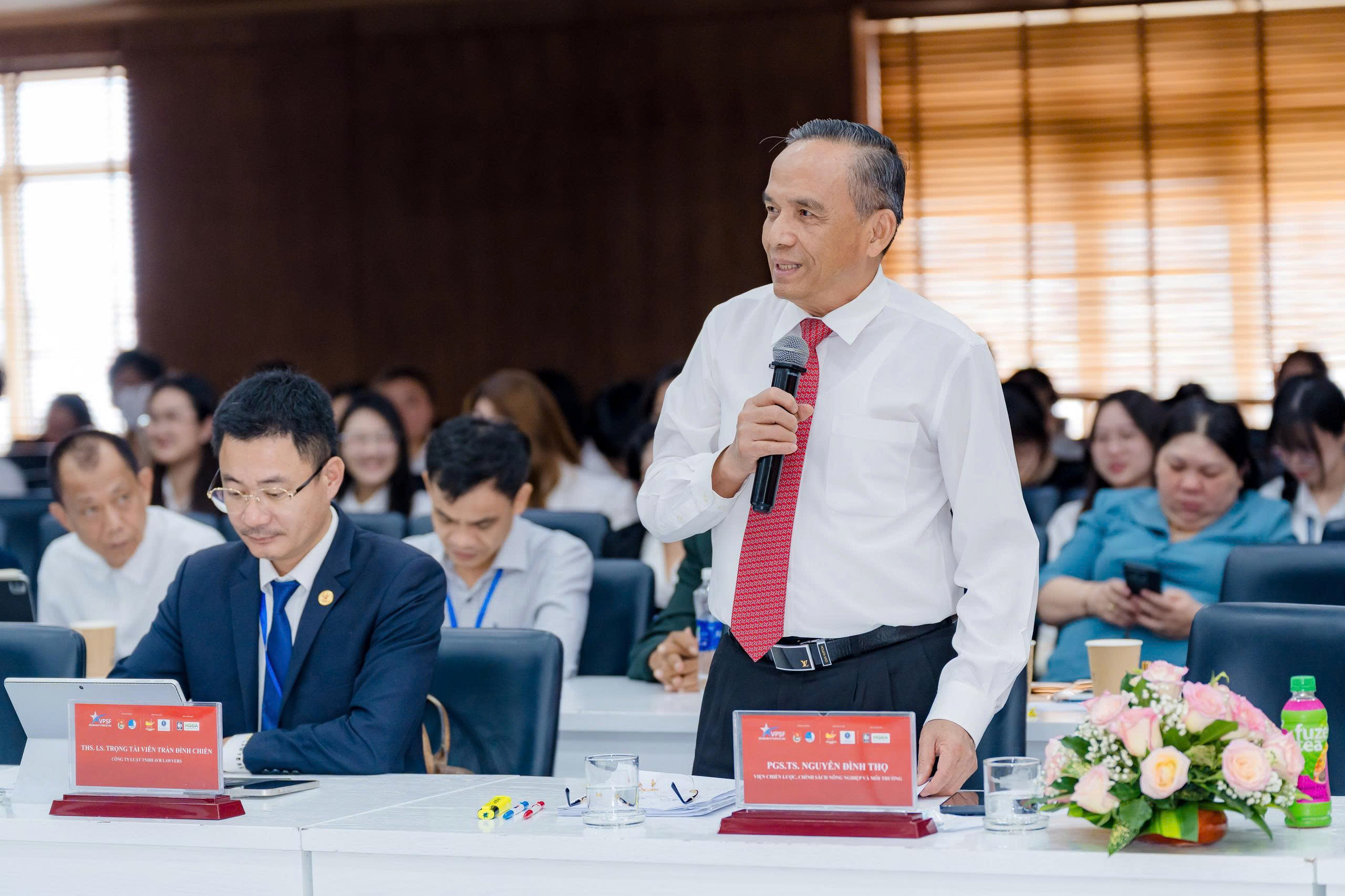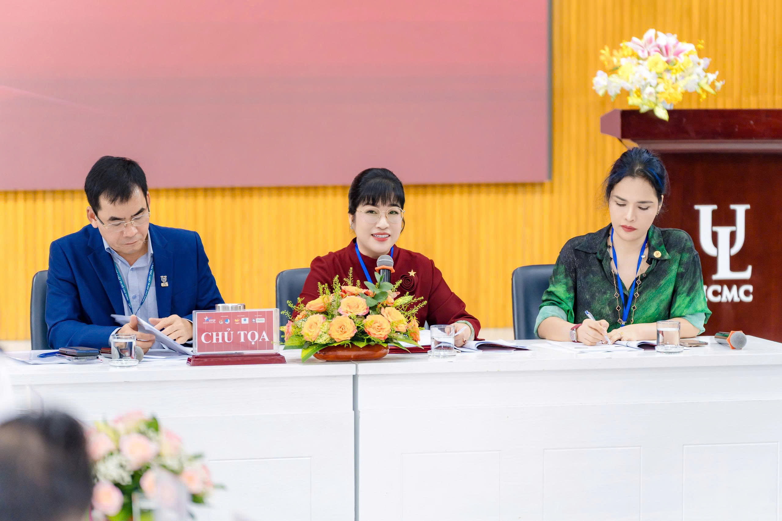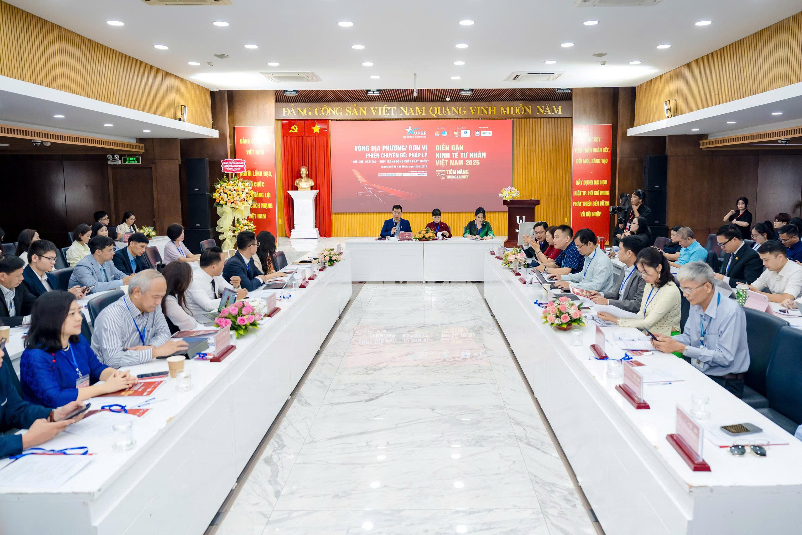 Các Phó Chủ tịch Hội DNT Việt Nam: chị Phạm Thị Bích Huệ, Trưởng BTC VPSF 2025; chị Lưu Thị Thanh Mẫu, Phó Trưởng BTC VPSF 2025, Phó CT Thuờng trực HGBA; TS Lê Trường Sơn, Hiệu trường Trường Đại học Luật TP Hồ Chí Minh; PGS.TS Trần Việt Dũng, Phó Hiệu trường Trường Đại học Luật TP Hồ Chí Minh cùng 200 đại biểu là đại diện các nhà khoa học, học giả, doanh nhân, sinh viên chuyên ngành Pháp lý tham dự Phiên chuyên đề.