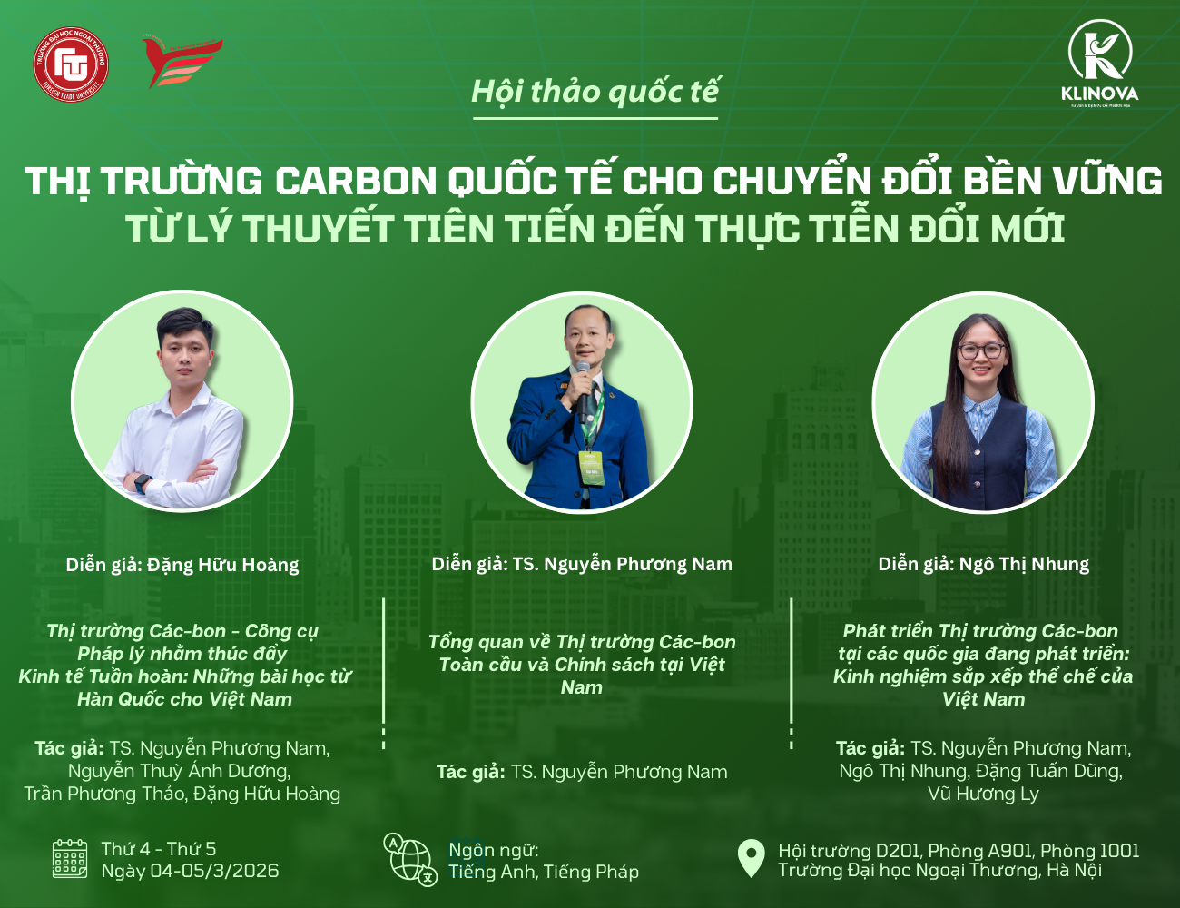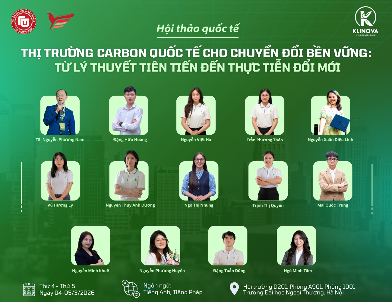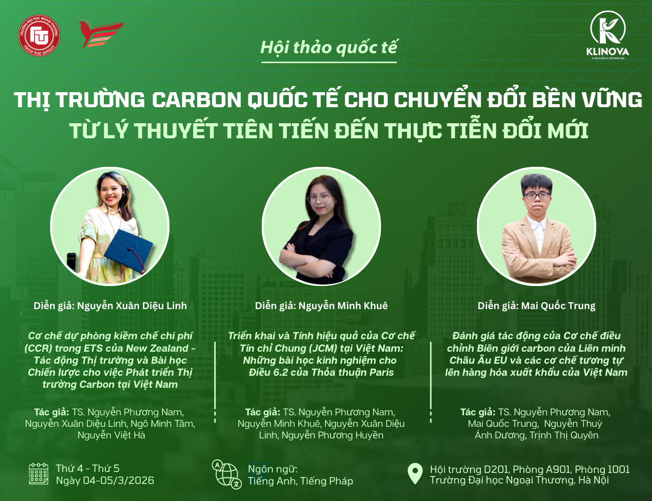 Ngày 04–05/03/2026, Hội thảo Quốc tế “Thị trường Carbon Quốc tế cho Chuyển đổi Bền vững: Từ Lý thuyết Tiên tiến đến Thực tiễn Đổi mới” sẽ diễn ra tại Trường Đại học Ngoại thương (FTU), Hà Nội, quy tụ các nhà nghiên cứu, chuyên gia và tổ chức quan tâm đến sự phát triển của thị trường các-bon và quá trình chuyển đổi xanh.