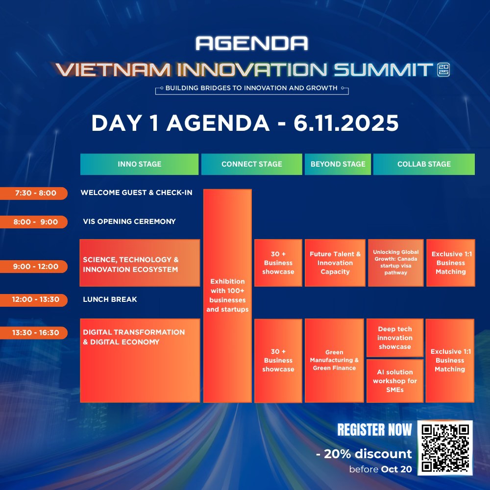 – Các phiên Deep Tech Showcase, AI Solution Workshop for SMEs, Mở khóa tăng trưởng toàn cầu: Lộ trình visa khởi nghiệp Canada mở ra cơ hội hợp tác cụ thể.