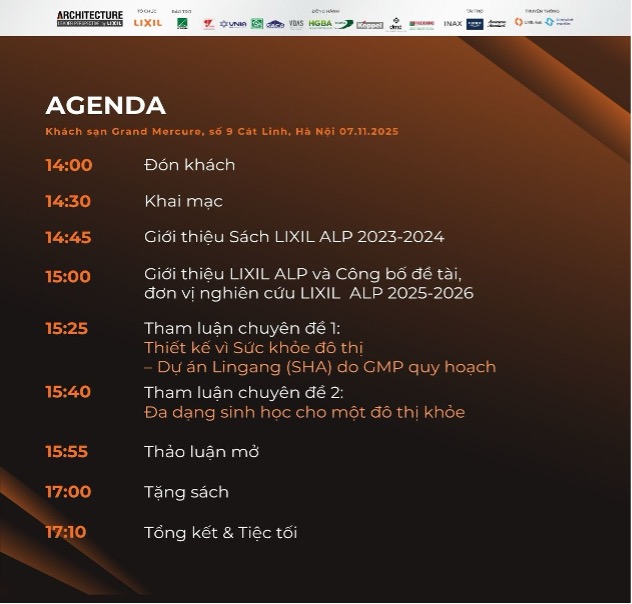 Chiều ngày 07/11/2025, tại khách sạn Grand Mercure (số 9 Cát Linh, Hà Nội), LIXIL Việt Nam tổ chức sự kiện LIXIL Architecture Leader Perspective (LIXIL ALP) 2025-2026: “Sức khỏe Đô thị cho Tương lai Không gian sống Việt: Gặp gỡ – Đối thoại – Cộng hưởng”.