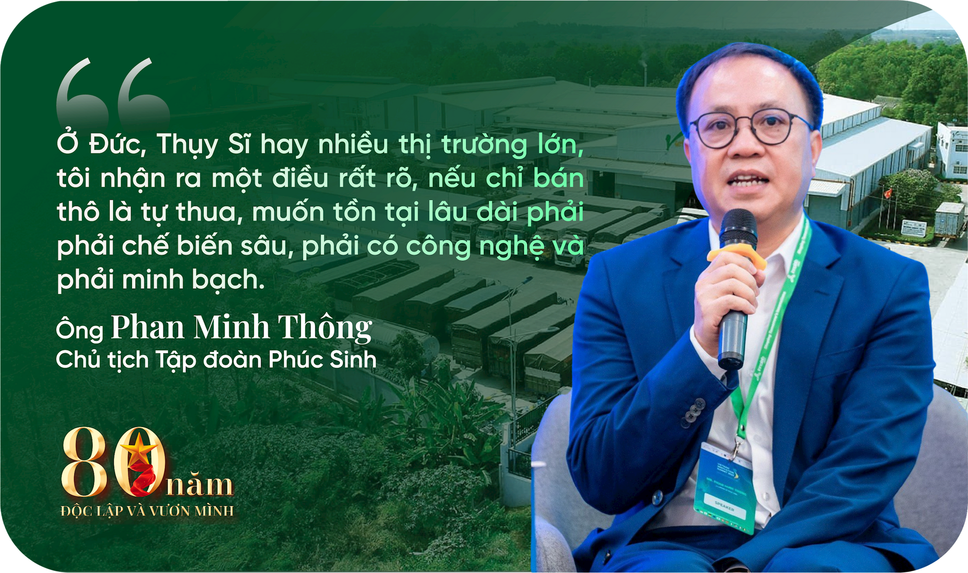 Đi cùng với đó, chúng tôi chia lợi nhuận để liên tục tái đầu tư: Một phần cho công nghệ, một phần cho kiểm toán, quản trị, và một phần cho nhà máy chế biến sâu, cũng như cho con người. Đó là những quyết định khó khăn vào thời điểm cách đây 20 năm, nhưng đến nay tôi nghĩ đó là hướng đi sáng suốt. Nhờ vậy, Phúc Sinh mới có thể đi ra thế giới, đưa nông sản Việt Nam đến những thị trường khó tính nhất và khẳng định được giá trị thật.