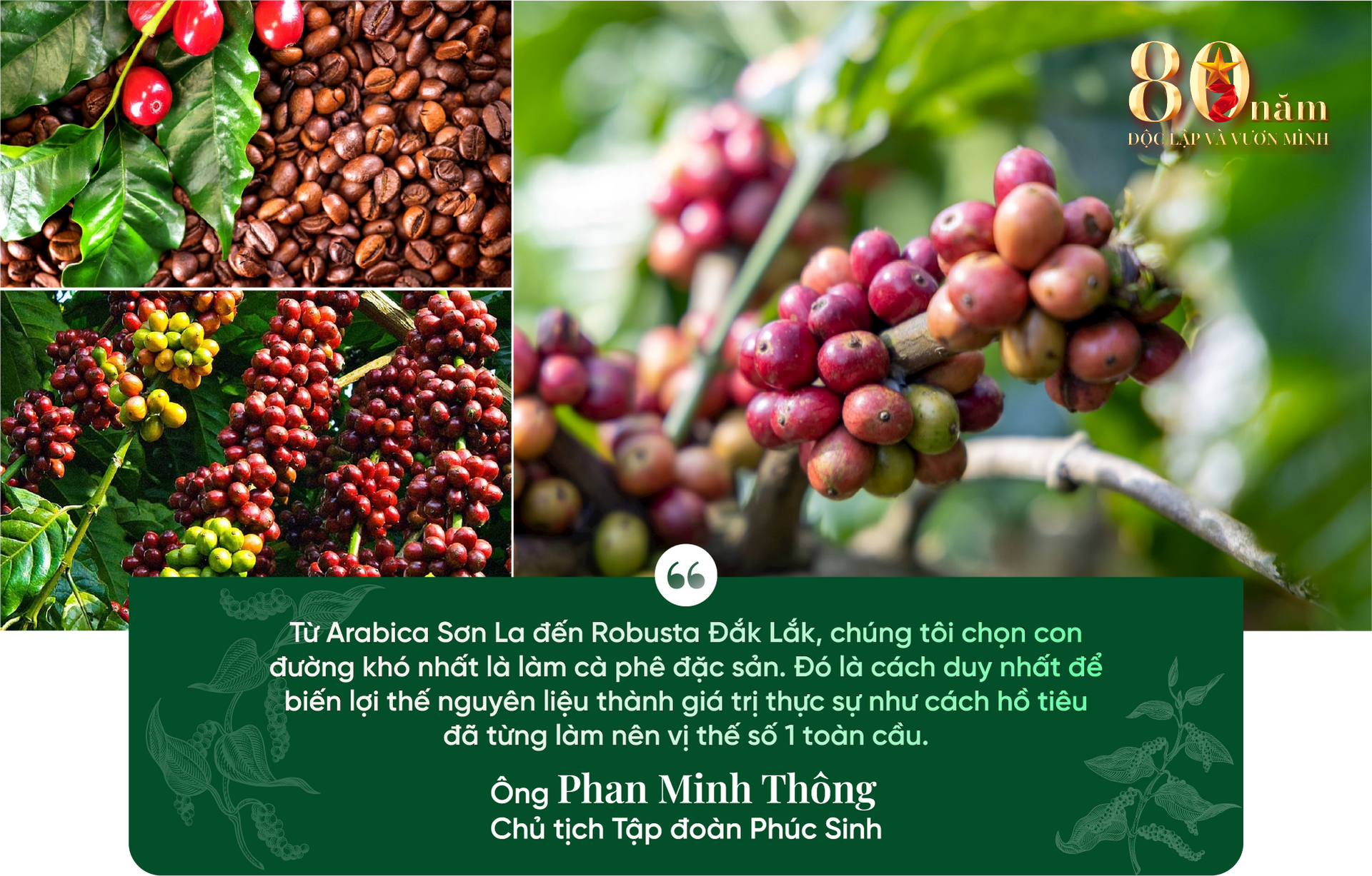 Còn với cà phê, tôi nhìn thấy cơ hội không kém phần to lớn. Việt Nam có thể nói là đang ngự trị nguồn lợi vô giá từ cà phê, với sản lượng và chất lượng nguyên liệu thuộc hàng tốt nhất thế giới. Vấn đề là chúng ta phải biết chế biến sâu, tạo ra giá trị gia tăng. Phúc Sinh đã bắt đầu con đường này bằng Arabica ở Sơn La. Khi chúng tôi đầu tư nhà máy ở đó, không chỉ doanh nghiệp được hưởng lợi mà cả cộng đồng cũng thay đổi, nông dân giàu có hơn, tự chủ hơn. Và chính chất lượng Arabica Sơn La đã khiến nhiều khách hàng quốc tế tìm đến tận nơi, biến vùng đất này thành một điểm sáng mới trên bản đồ cà phê đặc sản toàn cầu.