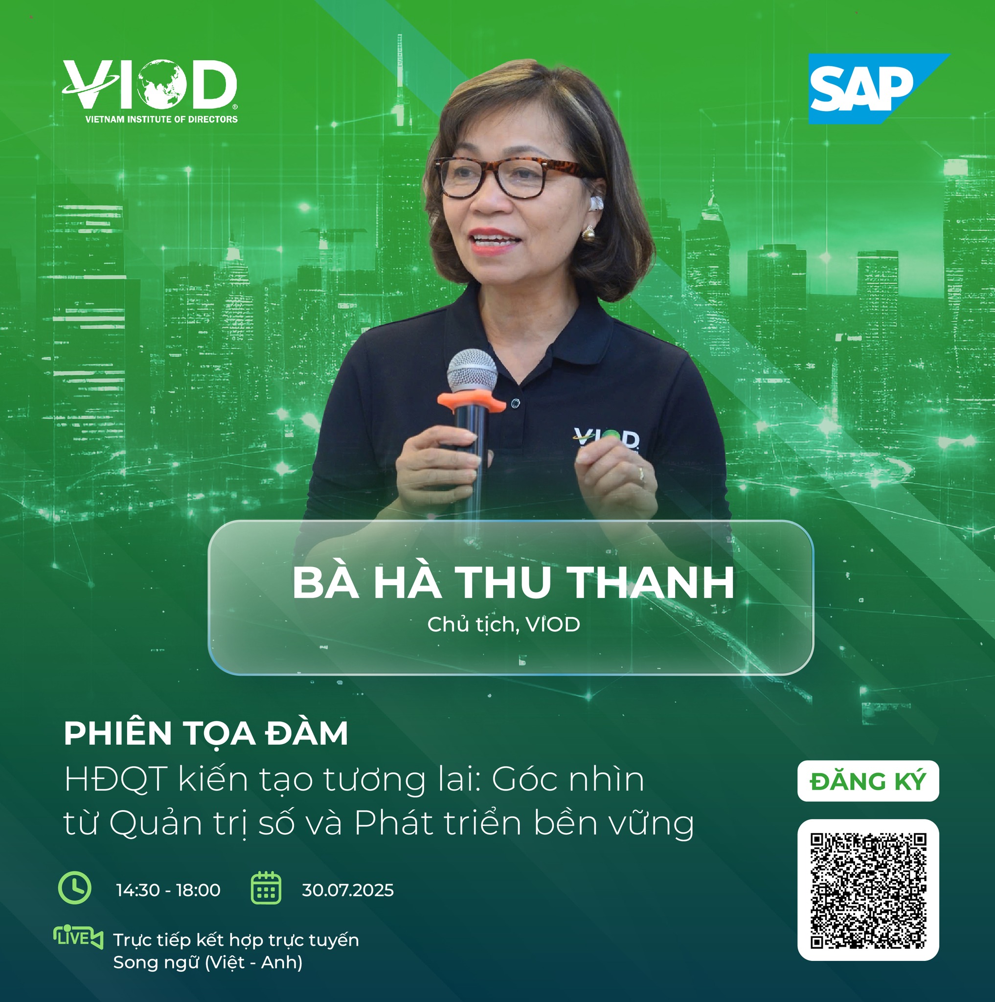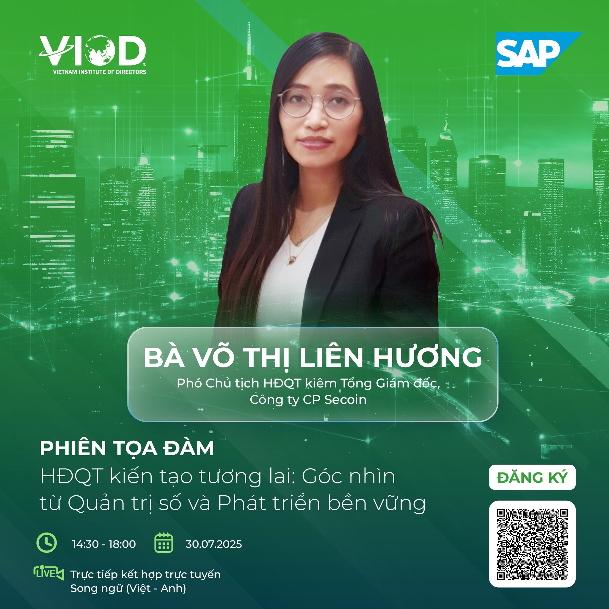 Phiên tọa đàm “HĐQT kiến tạo tương lai: Góc nhìn từ Quản trị số và Phát triển bền vững” vào ngày 31/07/2025 sẽ có sự tham dự của Bà Võ Thị Liên Hương, Ủy viên Ban chấp hành HGBA, Phó Chủ tịch HĐQT kiêm Tổng Giám đốc, Công ty CP Secoin