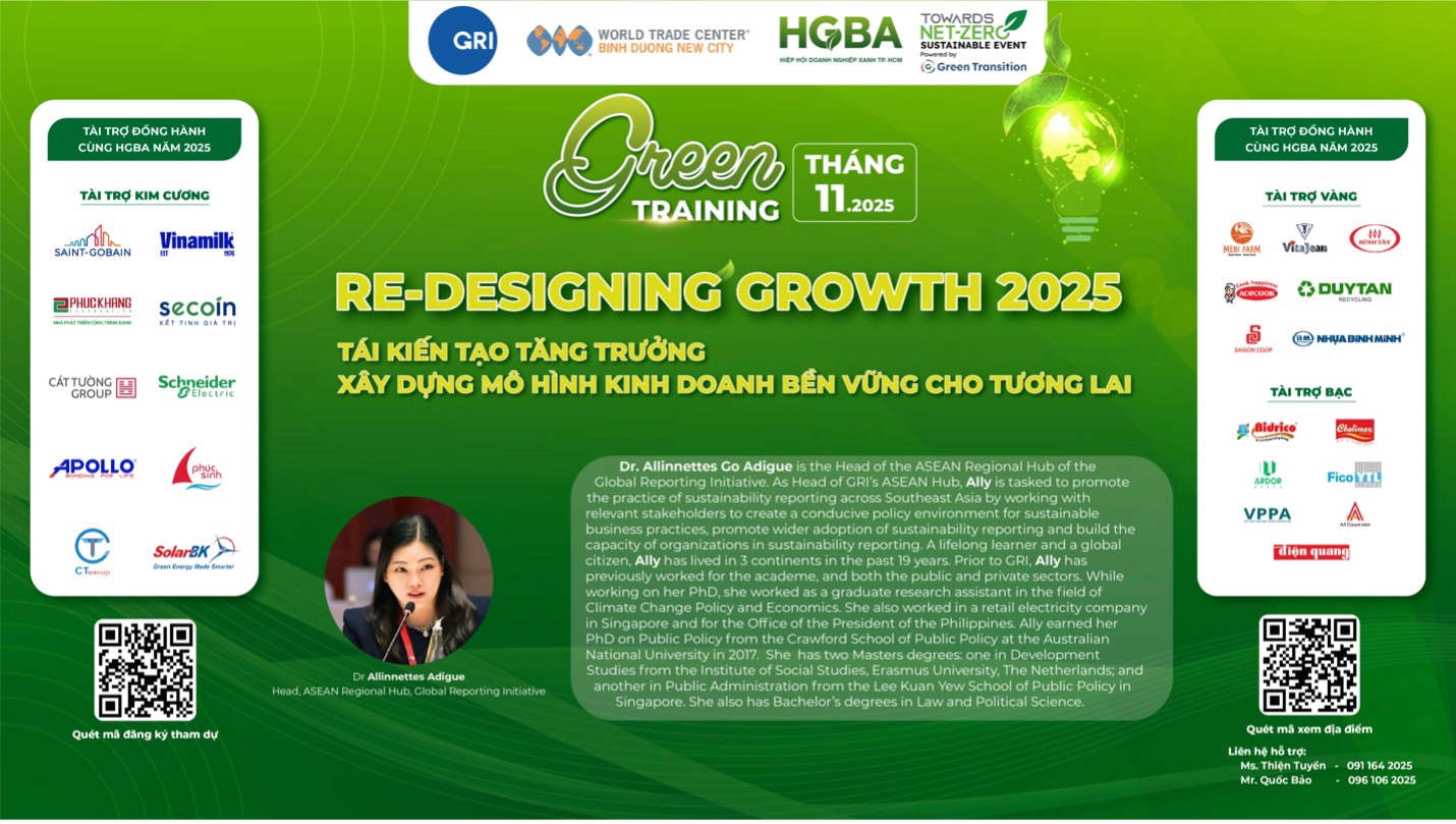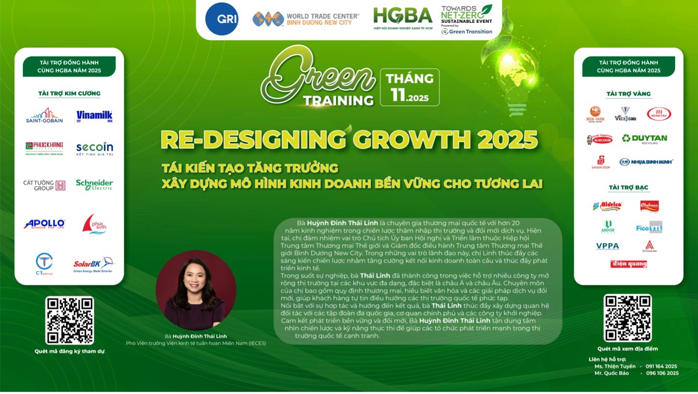 Re-Designing Growth 2025 được phối hợp tổ chức bởi World Trade Center Bình Dương New City (World Trade Center Binh Duong New City), Hiệp hội Doanh nghiệp Xanh TP. Hồ Chí Minh (HGBA) và Global Reporting Initiative (GRI), với mục tiêu đồng hành cùng cộng đồng doanh nghiệp trong hành trình chuyển đổi xanh và phát triển bền vững.