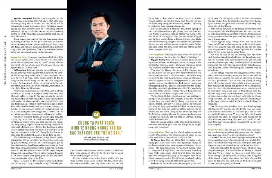 Trò chuyện cùng Forbes Việt Nam tìm lời giải cho những vấn đề này qua chia sẻ của các chuyên gia và lãnh đạo doanh nghiệp: ông Nguyễn Trường Hải – tổng giám đốc Saint-Gobain Việt Nam; ông Tô Thanh Sơn – giám đốc Phát triển bền vững SGS Việt Nam và ông Lê Anh – giám đốc Phát triển bền vững Duy Tân Recycling.