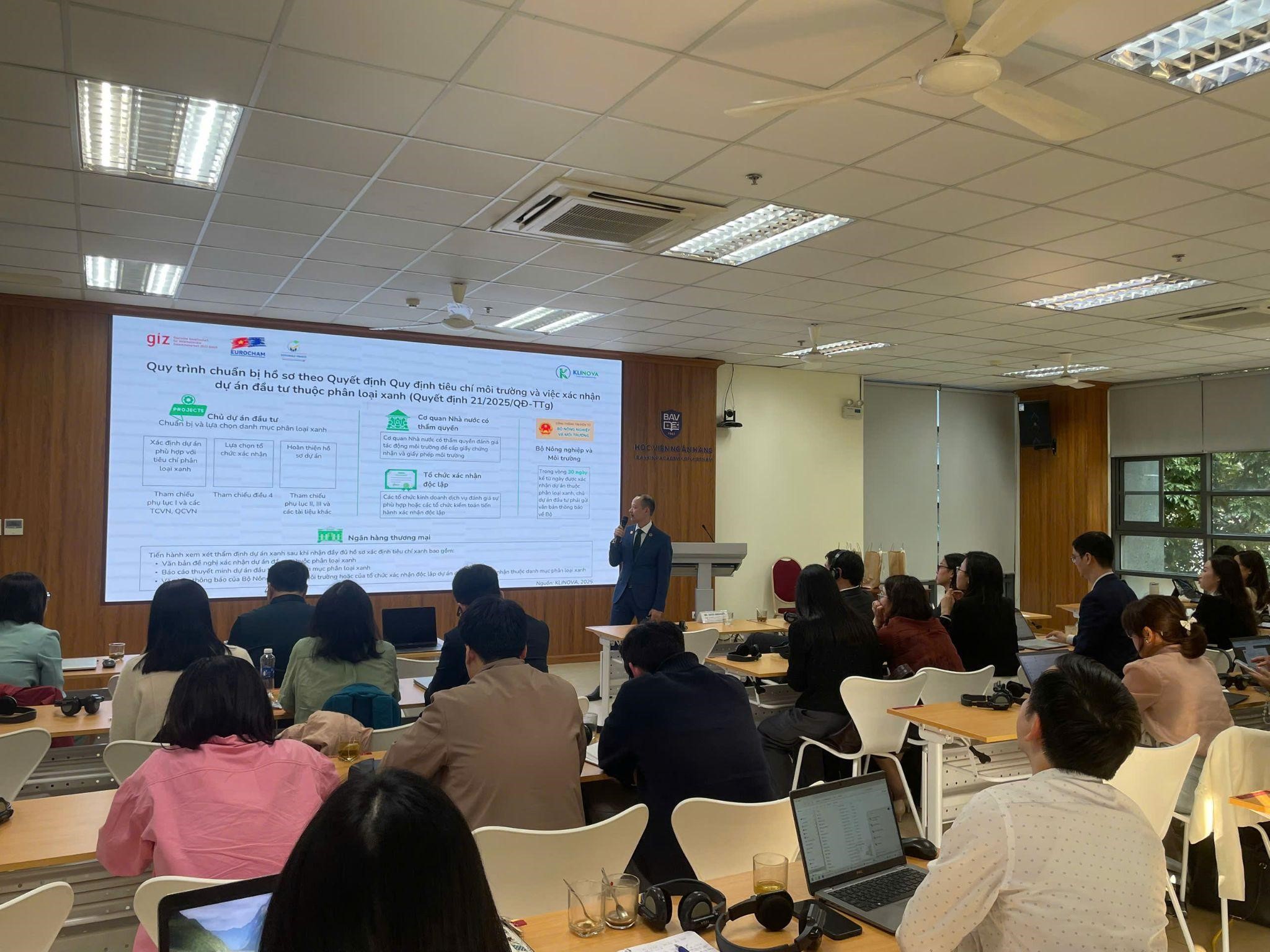 Trong phiên tập huấn này, các chuyên gia đã trình bày quy trình xác định và xác nhận dự án đầu tư thuộc danh mục phân loại xanh theo các quy định hiện hành, bao gồm các bước từ sàng lọc dự án, xác định mức độ đáp ứng tiêu chí môi trường, chuẩn bị hồ sơ dự án, lựa chọn tổ chức xác nhận độc lập, đến quá trình thẩm định của cơ quan quản lý nhà nước. Nội dung này giúp người tham gia hiểu rõ hơn về cách thức áp dụng hệ thống phân loại xanh trong thực tiễn, cũng như vai trò của các tổ chức tài chính trong việc hỗ trợ các dự án đầu tư xanh.