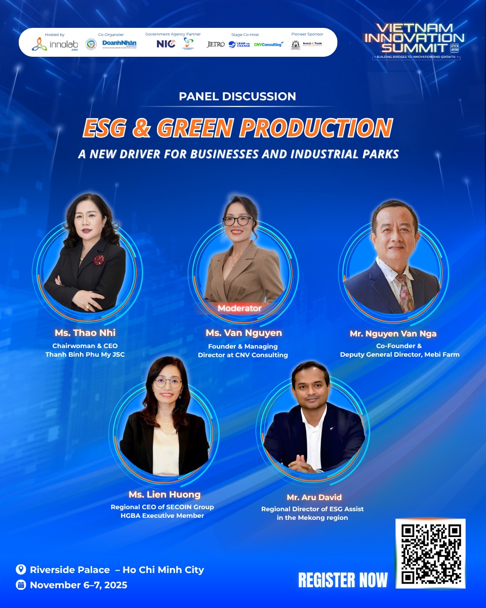 Chúng tôi hân hạnh giới thiệu Bà Võ Thị Liên Hương là diễn giả chính thức của Phiên thảo luận “ESG & Sản xuất xanh: Động lực mới cho doanh nghiệp và khu công nghiệp” tại Vietnam Innovation Summit 2025.