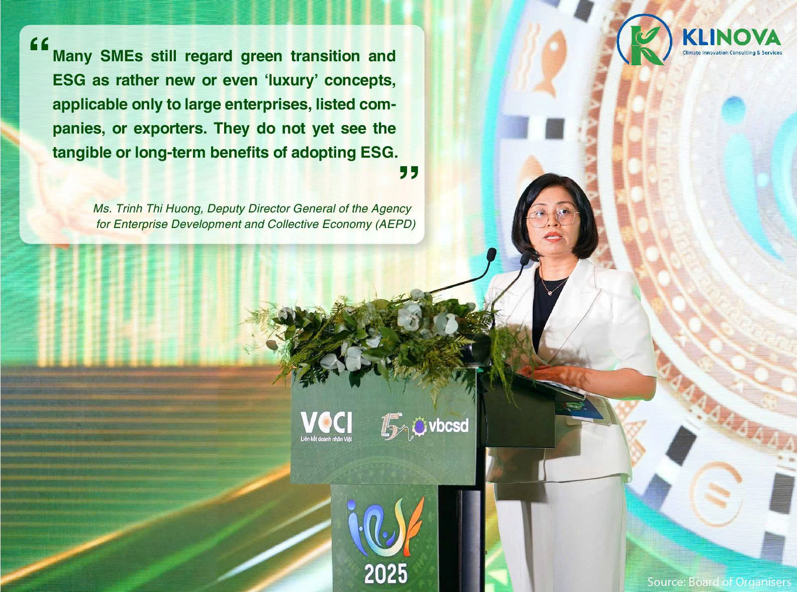 Trong khuôn khổ Diễn đàn Doanh nghiệp phát triển bền vững Việt Nam (VCSF) 2025: “Phát triển bền vững trong kỷ nguyên mới: Biến khát vọng vươn mình thành hành động”, đại diện Bộ Tài chính trình bày tham luận chủ đề “Doanh nghiệp chuyển đổi xanh – Động lực mới của tăng trưởng và phát triển khu vực kinh tế tư nhân”, bà Trịnh Thị Hương, Cục Phó cục Phát triển doanh nghiệp tư nhân và Kinh tế tập thể (AEPD) cho biết “Nhiều SMEs vẫn coi chuyển đổi xanh, ESG là khái niệm khá mới mẻ/xa xỉ hoặc chỉ dành cho doanh nghiệp lớn, DN niêm yết, DN xuất khẩu. Họ chưa nhìn thấy giá trị thiết thực hoặc dài hạn của việc áp dụng ESG”.